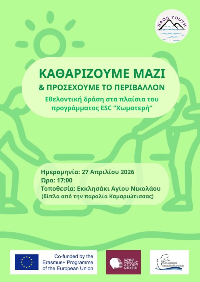 Ανοιχτό κάλεσμα σε εθελοντές και εθελόντριες απευθύνει η ομάδα Saos Youth για δράση καθαρισμού του παραλιακού μετώπου στην περιοχή του Αγίου Νικολάου στην Καμαριώτισσα Σαμοθράκης.