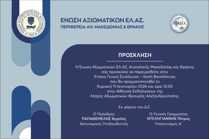 Η Ένωση Αξιωματικών Ελληνικής Αστυνομίας Ανατολικής Μακεδονίας και Θράκης προσκαλεί τα μέλη της, καθώς και τους/τις συζύγους τους, στην Ετήσια Γενική Συνέλευση και Κοπή Βασιλόπιτας, που θα πραγματοποιηθεί την Κυριακή 11 Ιανουαρίου 2026 και ώρα 11:30, στην αίθουσα εκδηλώσεων της Λέσχης Αξιωματικών Φρουράς Αλεξανδρούπολης (Λεωφόρος Δημοκρατίας 333, Αλεξανδρούπολη).