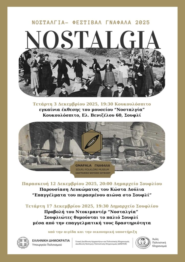 Το Λαογραφικό Μουσείο Σουφλίου «Γνάφαλα» παρουσιάζει το φεστιβάλ «Γνάφαλα 2025 – Νοσταλγία», μια σειρά εκδηλώσεων αφιερωμένη στη μνήμη, τα επαγγέλματα και την κοινωνική πορεία του Σουφλίου τον περασμένο αιώνα. Η θεματική της φετινής διοργάνωσης επικεντρώνεται στη νοσταλγία και στη διαδρομή της τοπικής αγοράς, όπως αυτή αποτυπώνεται μέσα από εργαλεία, φωτογραφικά ντοκουμέντα και προσωπικές μαρτυρίες κατοίκων.