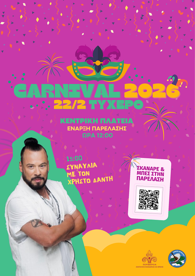 Η Οργανωτική Επιτροπή των εκδηλώσεων «Καρναβάλι Τυχερού 2026», σε συνεργασία με την Περιφέρεια Ανατολικής Μακεδονίας & Θράκης και τον Δήμο Σουφλίου, προσκαλεί μικρούς και μεγάλους να συμμετάσχουν στο Καρναβάλι Τυχερού 2026, μια ξεχωριστή αποκριάτικη γιορτή γεμάτη κέφι, χορό και μουσική, που θα πλημμυρίσει τους δρόμους της πόλης με χρώμα και ζωντάνια.