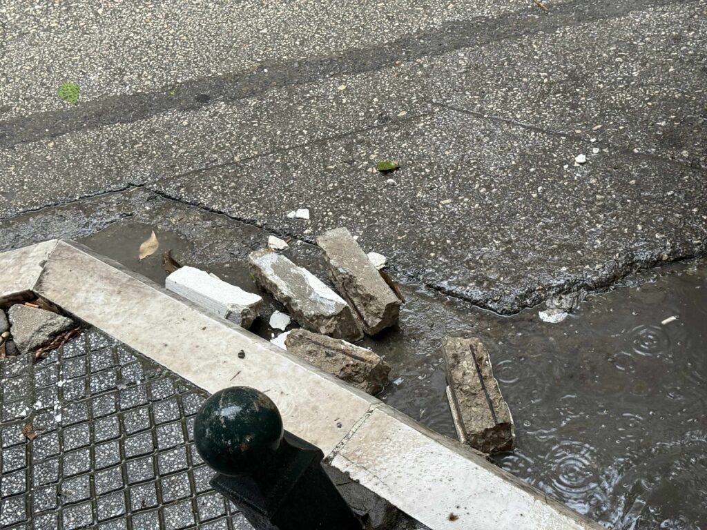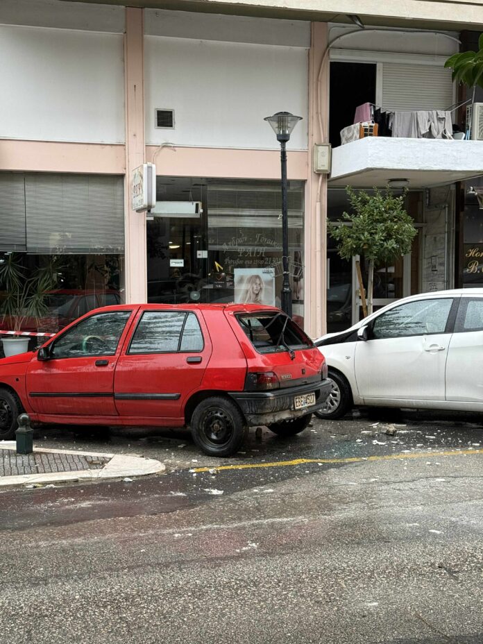 Το κομμάτι, μήκους αρκετών μέτρων, αποκολλήθηκε και κατέληξε στο οδόστρωμα και το πεζοδρόμιο, προκαλώντας ζημιές σε σταθμευμένο αυτοκίνητο, του οποίου έσπασε τα τζάμια.