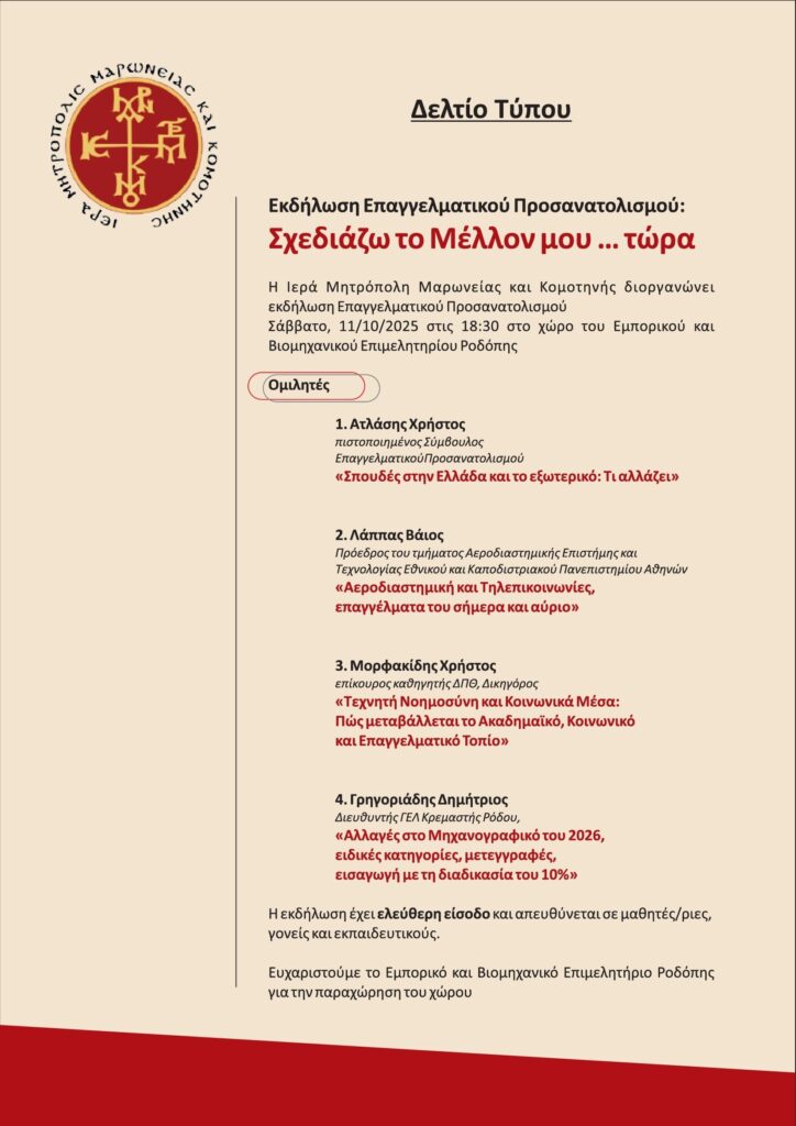 Ἡ Ἱερὰ Μητρόπολη Μαρωνείας καὶ Κομοτηνῆς διοργανώνει ἐκδήλωση Σχολικοῦ Ἐπαγγελματικοῦ Προσανατολισμοῦ τὸ Σάββατο, 11 Ὀκτωβρίου 2025 καὶ ὥρα 18:30 στὴν αἴθουσα τοῦ Ἐμπορικοῦ καὶ Βιομηχανικοῦ Ἐπιμελητηρίου Ροδόπης.