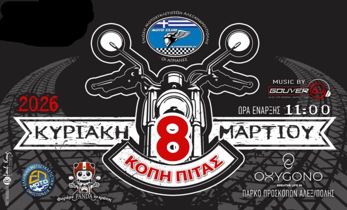 Το Moto Club Αλεξανδρούπολης «Οι Αγριάνες» καλεί τους φίλους και τις φίλες της λέσχης στην καθιερωμένη εκδήλωση κοπής πίτας, την Κυριακή 8 Μαρτίου 2026, στις 11:00 π.μ.