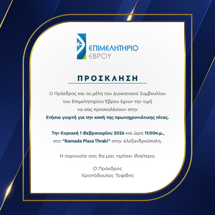 Την Κυριακή 1 Φεβρουαρίου 2026 θα πραγματοποιηθεί η ετήσια εκδήλωση κοπής της πρωτοχρονιάτικης πίτας του Επιμελητηρίου Έβρου στο ξενοδοχείο Ramada Plaza Thraki.