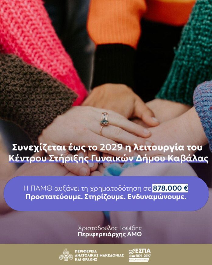 Η Περιφέρεια Ανατολικής Μακεδονίας και Θράκης προχωρά σε σημαντική ενίσχυση του Κέντρου Στήριξης Γυναικών του Δήμου Καβάλας, εξασφαλίζοντας τη συνέχιση της λειτουργίας του έως το 2029. Η χρηματοδότηση αυξάνεται από 249.500 ευρώ σε 878.000 ευρώ, με πόρους από την Περιφέρεια και συγχρηματοδότηση του Ευρωπαϊκού Κοινωνικού Ταμείου (ΕΚΤ+).