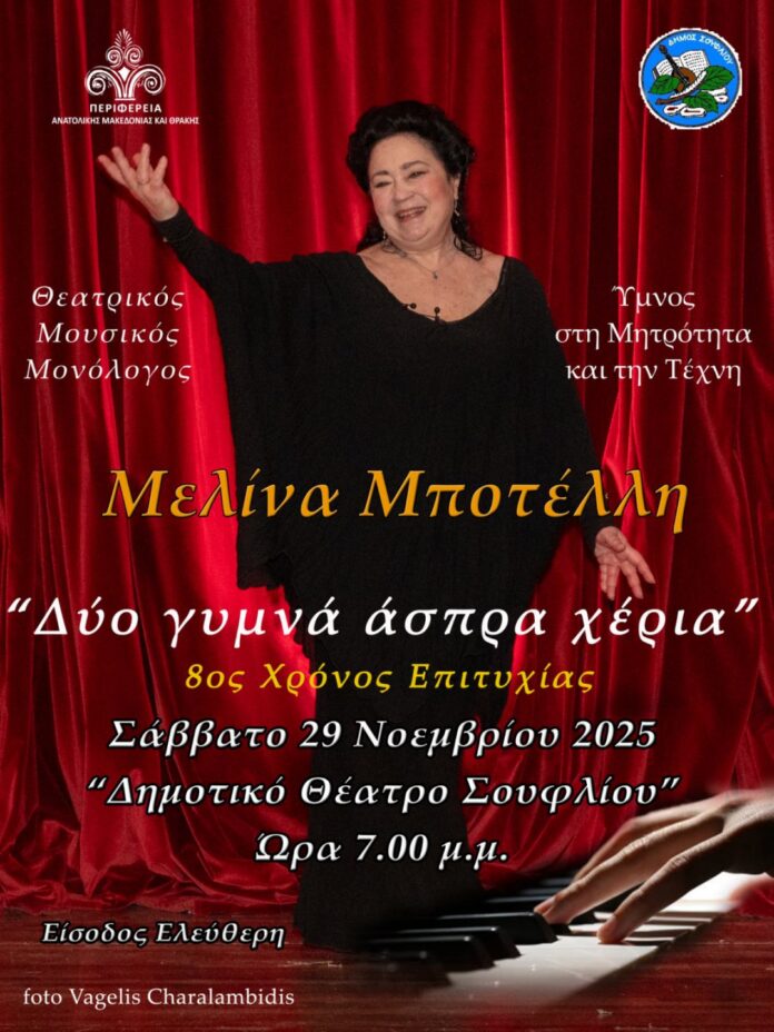 Η Περιφέρεια Ανατολικής Μακεδονίας και Θράκης, σε συνεργασία με τον Δήμο Σουφλίου, παρουσιάζουν τη θεατρική παράσταση «Δύο γυμνά άσπρα χέρια» με τη Μελίνα Μποτέλλη, το Σάββατο 29 Νοεμβρίου 2025, στις 19:00, στο Δημοτικό Θέατρο Σουφλίου.