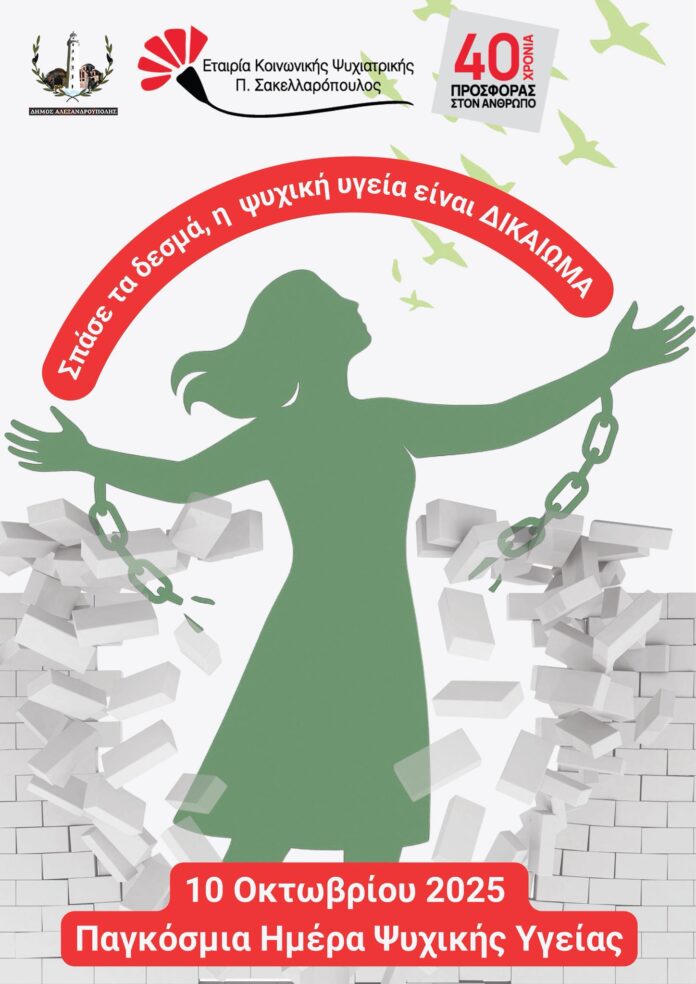 Την Παρασκευή 10 Οκτωβρίου 2025, στις 10:00 το πρωί, μπροστά στο Δημαρχείο Αλεξανδρούπολης, θα πραγματοποιηθεί μια ιδιαίτερη μουσική εκδήλωση με τίτλο «Μελωδίες για την Ψυχή», αφιερωμένη στην Παγκόσμια Ημέρα Ψυχικής Υγείας.