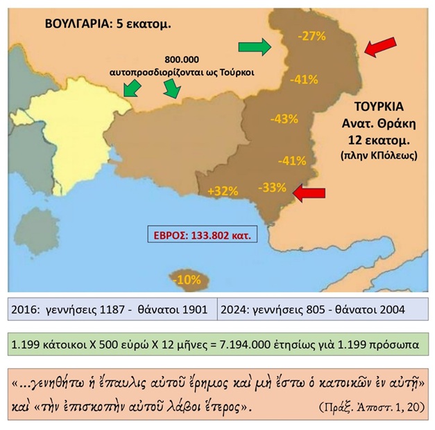 Τώρα﮲ τι φταίει και στις δυτικές κοινωνίες ή τις δυτικο-αναθρεμμένες (όπως η δική μας), μειώνονται οι γεννήσεις, αυτό είναι «αλλουνού παπά ευαγγέλιο» και δεν είναι του παρόντος. Επειδή δεν θέλω να σας καταπονήσω με αναλυτικά στατιστικά στοιχεία, ετοίμασα να σας δείξω μόνο αυτόν τον χάρτη, όπου θα κατανοήσετε, γιατί το δημογραφικό πρόβλημα στη Θράκη και στον Έβρο δεν είναι το ίδιο με αντίστοιχα προβλήματα, άλλων Νομών η Περιφερειών της Χώρας μας.