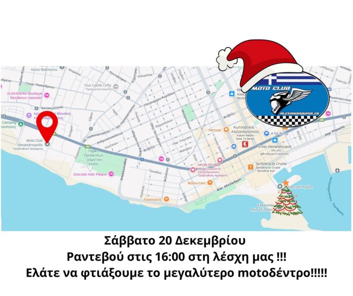 Το ραντεβού έχει δοθεί για το Σάββατο 20 Δεκεμβρίου στις 16:00, στη λέσχη του συλλόγου. Οι συμμετέχοντες θα πραγματοποιήσουν Χριστουγεννιάτικη πορεία μέχρι το λιμάνι της Αλεξανδρούπολης, όπου θα σχηματίσουν το μεγαλύτερο Χριστουγεννιάτικο motoδέντρο.