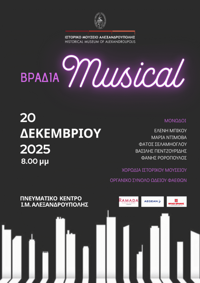 Το Ιστορικό Μουσείο Αλεξανδρούπολης κλείνει το 2025 με μια ξεχωριστή μουσική βραδιά αφιερωμένη στον μαγικό κόσμο του musical, το Σάββατο 20 Δεκεμβρίου, στις 8 μ.μ., στο Πνευματικό Κέντρο της Ιεράς Μητρόπολης Αλεξανδρούπολης. Η εκδήλωση πραγματοποιείται σε συνεργασία με τον καθηγητή του Τμήματος Μουσικών Σπουδών του Πανεπιστημίου Ιωαννίνων, Θανάση Τρικούπη.