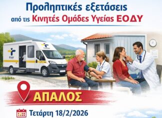 Οι Κινητές Ομάδες Υγείας του ΕΟΔΥ θα πραγματοποιήσουν προληπτικές ιατρικές εξετάσεις στον Απαλό την Τετάρτη 18 Φεβρουαρίου 2026.