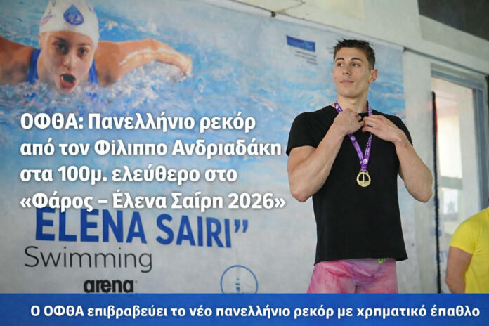 Ο Φίλιππος Ανδριαδάκης πραγματοποίησε εξαιρετική εμφάνιση στην 5η αγωνιστική του διεθνούς μίτινγκ κολύμβησης «Φάρος – Έλενα Σαΐρη 2026», που διεξάγεται στην Αλεξανδρούπολη, κατακτώντας την 1η θέση στα 100μ. ελεύθερο.