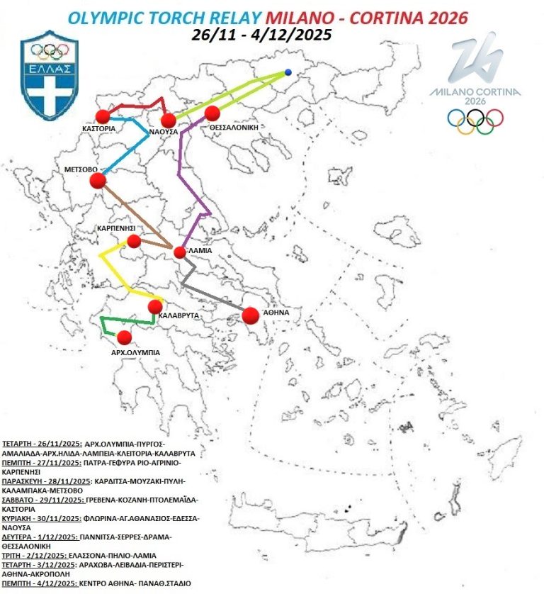 Η διαδρομή της Ολυμπιακής Λαμπαδηδρομίας η οποία θα διαρκέσει 9 ημέρες, καλύπτοντας 2.200 χιλιόμετρα, διασχίζοντας 23 νομούς και 7 Περιφέρειες, με τη διαδρομή να ξεκινά από την Αρχαία Ολυμπία καταλήγοντας στο Παναθηναϊκό Στάδιο στις 4 Δεκεμβρίου για την Τελετή Παράδοσης στην Οργανωτική Επιτροπή «Μιλάνο–Κορτίνα 2026».