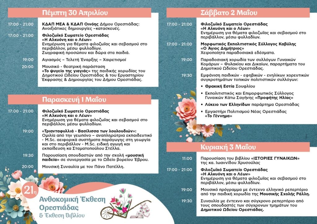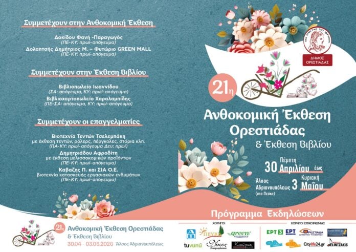 Με επίκεντρο τη φύση, τον πολιτισμό και το βιβλίο, επιστρέφει η 21η Ανθοκομική Έκθεση Ορεστιάδας σε συνδυασμό με την Έκθεση Βιβλίου, από τις 30 Απριλίου έως τις 3 Μαΐου 2026, στο Άλσος Αδριανουπόλεως.