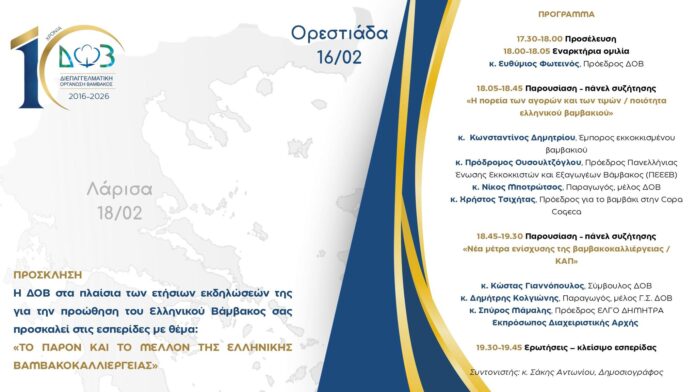 Η εσπερίδα απευθύνεται στους παραγωγούς βαμβακιού και έχει στόχο την ενημέρωσή τους για τις τρέχουσες εξελίξεις, τις προκλήσεις και τις προοπτικές της βαμβακοκαλλιέργειας στην Ελλάδα. Η είσοδος για το κοινό είναι ελεύθερη.