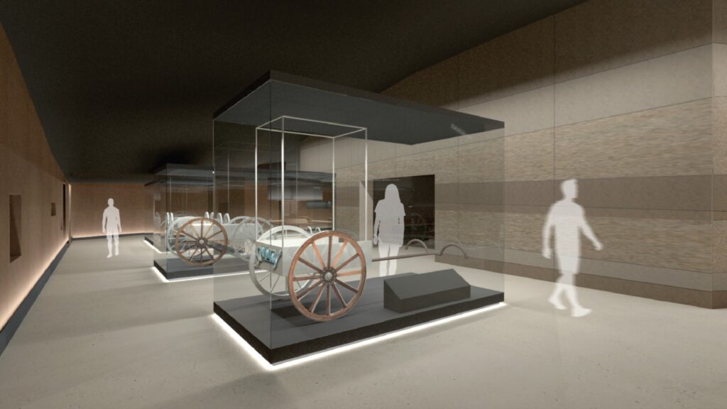 Βασική αρχή της ανάδειξης των ταφικών συνόλων είναι η διατήρηση της ανασκαφικής εικόνας των λάκκων των καύσεων, των αμαξών και των αλόγων, ως αδιάσπαστη ενότητα. Η έκθεση αναδεικνύει τα σκελετικά κατάλοιπα 15 αλόγων και ενός σκύλου -ένδειξη ότι ο ιδιοκτήτης της άμαξας ασχολούνταν με το κυνήγι- καθώς και περίπου 250 αρχαιότητες, που βρέθηκαν στον τύμβο. Η αναπαράσταση των καύσεων και των ταφών συνιστά το κυρίαρχο θέμα του Μουσείου. Στα κινητά αρχαιολογικά ευρήματα της ανασκαφής περιλαμβάνονται πολυάριθμα κτερίσματα, μεταλλικά εξαρτήματα των αμαξών, διακοσμητικά στοιχεία από την ιπποσκευή των αλόγων, αλλά και οργανικά υλικά. Οι ιατρικές εργαλειοθήκες της Δοξιπάρας είναι διεθνώς οι καλύτερα διατηρημένες του είδους, από τους αυτοκρατορικούς χρόνους.