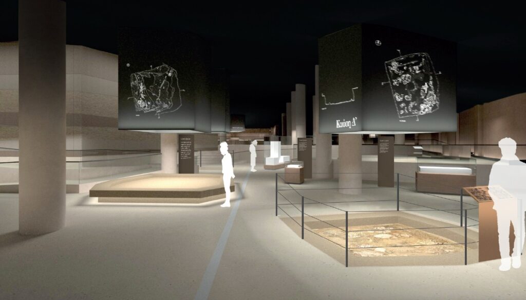 Οι μουσειογραφικές αρχές της έκθεσης άπτονται της διαμόρφωσης μιας ευκρινούς και απλής αφηγηματικής πορείας, αλλά και της εξασφάλισης των κατάλληλων συνθηκών για τη διατήρηση, την προστασία και την ανάδειξη των αρχαιοτήτων. Ο κεντρικός πυρήνας της έκθεσης διαμορφώνεται σε δύο επίπεδα, ισόγειο και όροφο. Στο ισόγειο, διαμορφώνεται χώρος πολλαπλών χρήσεων για διαλέξεις, εκδηλώσεις και προβολές. Το δυτικό τμήμα του διαμορφώνεται σε εκθεσιακό χώρο και το ανατολικό ως αποθήκη. Στον όροφο εγκαθίστανται οι ηλεκτρομηχανολογικές εγκαταστάσεις του κτηρίου. Το έργο περιλαμβάνει τη διαμόρφωση του περιβάλλοντος χώρου, με πρόσβαση για άτομα με κινητικά προβλήματα, χώρους στάθμευσης και βοηθητικές εγκαταστάσεις, ώστε να μπορεί να υποδεχθεί μεγάλο αριθμό επισκεπτών και να λειτουργήσει ως σημαντικό κέντρο πολιτισμού και έρευνας.