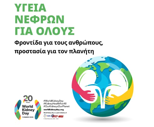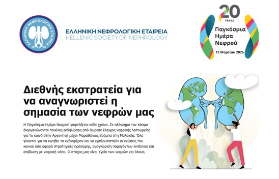 Η Παγκόσμια Ημέρα Νεφρού γιορτάζεται από το 2006 κάθε δεύτερη Πέμπτη του Μαρτίου με στόχο την ευαισθητοποίηση του κοινού για τη Χρόνια Νεφρική Νόσο (ΧΝΝ). Φέτος, η ημέρα αποκτά ιδιαίτερη σημασία για την Ελλάδα, καθώς συνδέεται με την υλοποίηση του προγράμματος «Προλαμβάνω», που στοχεύει στον έλεγχο νεφρικής δυσλειτουργίας με αποστολή παραπεμπτικών μέσω SMS σε ομάδες υψηλού κινδύνου, όπως ασθενείς με Σακχαρώδη Διαβήτη, Αρτηριακή Υπέρταση, Καρδιαγγειακή νόσο ή Παχυσαρκία. Οι δωρεάν προληπτικές εξετάσεις περιλαμβάνουν αίμα (κρεατινίνη) και ούρα (πηλίκο λευκωματίνης/κρεατινίνης).