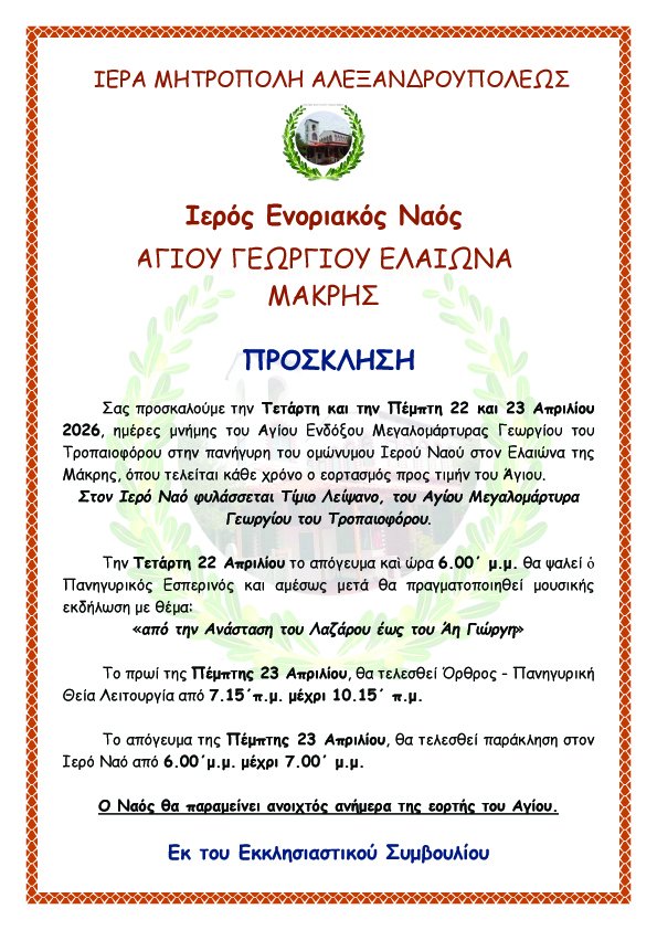 ΑρχικήΕιδήσειςΚοινωνιαΠανήγυρις Ιερού Ναού Αγίου Γεωργίου Ελαιώνα Μάκρης