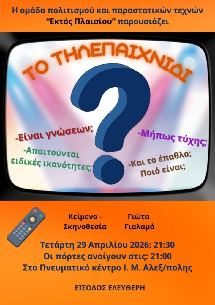 Η ομάδα πολιτισμού και παραστατικών τεχνών «Εκτός Πλαισίου» παρουσιάζει τη φετινή της θεατρική παράσταση με τίτλο «Το Τηλεπαιχνίδι» στην Αλεξανδρούπολη.