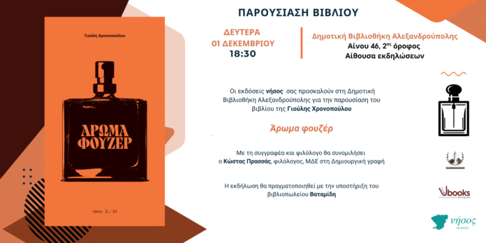 Το βιβλιοπωλείο Βαταμίδης σε συνεργασία με τις εκδόσεις Νήσος σας προσκαλούν τη Δευτέρα 1 Δεκεμβρίου 2025, στις 18:30, στη Δημοτική Βιβλιοθήκη Αλεξανδρούπολης (Καπομάγαζο), για την παρουσίαση του βιβλίου της Γιούλης Χρονοπούλου, με τίτλο «Άρωμα Φουζέρ».