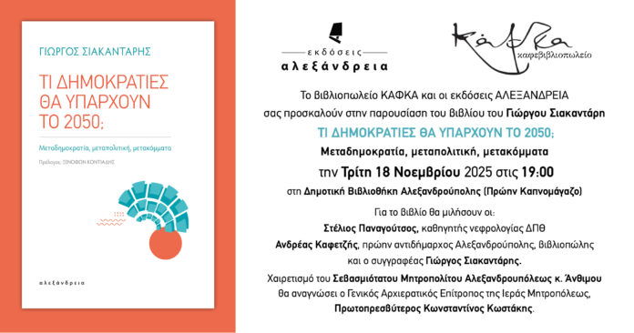 Η Δημοτική Βιβλιοθήκη Αλεξανδρούπολης φιλοξενεί την Τρίτη 18 Νοεμβρίου 2025 την παρουσίαση του βιβλίου του Γιώργου Σιακαντάρη με τίτλο «Τι δημοκρατίες θα υπάρχουν το 2050;».