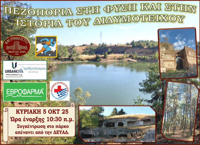 Στο πλαίσιο του 16ου Φεστιβάλ Ερυθροποτάμου, ο Δρομέας Θράκης και ο Ιστορικός και Πολιτιστικός Σύλλογος Διδυμοτείχου «Καστροπολίτες – Γνώση και Δράση», σας προσκαλούν σε μία πεζοπορία στη φύση και στην ιστορία του Διδυμοτείχου, την Κυριακή 5 Οκτωβρίου 2025.