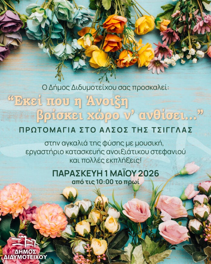 Ανοιχτή πρόσκληση προς τους πολίτες απευθύνει ο Δήμος Διδυμοτείχου για τον εορτασμό της Πρωτομαγιά στο Άλσος Τσίγγλας, την Παρασκευή 1 Μαΐου 2026.