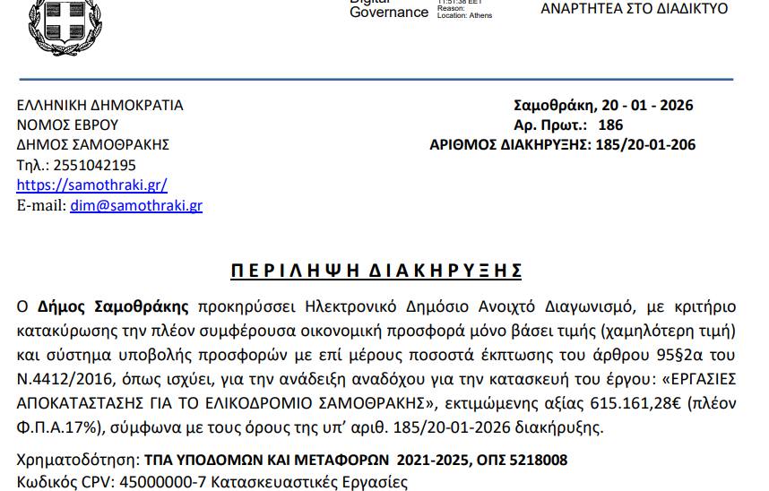 Ένα σημαντικό έργο υποδομής για τη Σαμοθράκη μπαίνει σε τροχιά υλοποίησης, καθώς σήμερα δημοπρατήθηκε ο ηλεκτρονικός διαγωνισμός για την πλήρη αποκατάσταση του Ελικοδρομίου Σαμοθράκης.