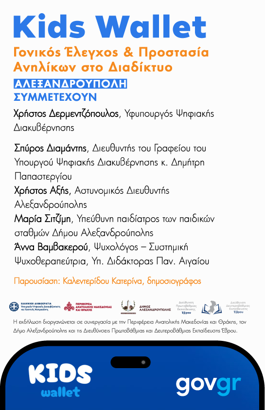 Ο Υφυπουργός Ψηφιακής Διακυβέρνησης, Χρήστος Δερμεντζόπουλος σε συνεργασία με την Περιφέρεια Ανατολικής Μακεδονίας και Θράκης, τον Δήμο Αλεξανδρούπολης, τον Δήμο Νέας Ορεστιάδας και τις Διευθύνσεις Πρωτοβάθμιας και Δευτεροβάθμιας Εκπαίδευσης Έβρου διοργανώνουν δύο εκδηλώσεις με θέμα «Kids Wallet: Γονικός έλεγχος & Προστασία Ανηλίκων στο Διαδίκτυο.», οι οποίες θα πραγματοποιηθούν: