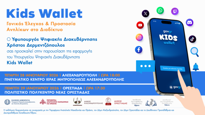 Ο Υφυπουργός Ψηφιακής Διακυβέρνησης, Χρήστος Δερμεντζόπουλος σε συνεργασία με την Περιφέρεια Ανατολικής Μακεδονίας και Θράκης, τον Δήμο Αλεξανδρούπολης, τον Δήμο Νέας Ορεστιάδας και τις Διευθύνσεις Πρωτοβάθμιας και Δευτεροβάθμιας Εκπαίδευσης Έβρου διοργανώνουν δύο εκδηλώσεις με θέμα «Kids Wallet: Γονικός έλεγχος & Προστασία Ανηλίκων στο Διαδίκτυο.», οι οποίες θα πραγματοποιηθούν: