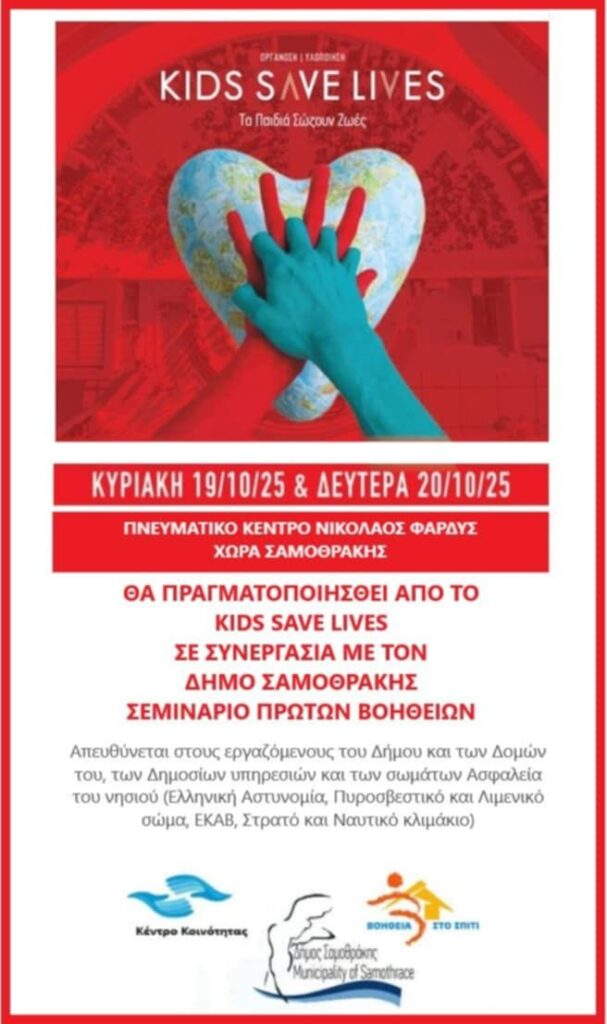 Ο Δήμος Σαμοθράκης, σε συνεργασία με την Ανθρωπιστική Οργάνωση Kids Save Lives, διοργανώνει σεμινάριο πρώτων βοηθειών για τους εργαζόμενους του Δήμου, των Δομών, των Δημόσιων Υπηρεσιών και των Σωμάτων Ασφαλείας.