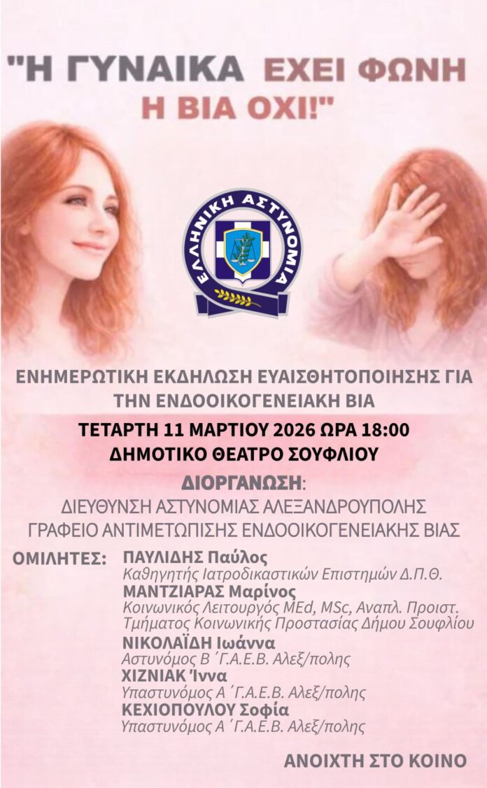 Η εκδήλωση θα πραγματοποιηθεί την Τετάρτη 11 Μαρτίου 2026, στις 18:00, στο Δημοτικό Θέατρο Σουφλίου και έχει στόχο την ενημέρωση του κοινού για ζητήματα που αφορούν τη βία κατά των γυναικών, την πρόληψη και τους τρόπους στήριξης των θυμάτων.