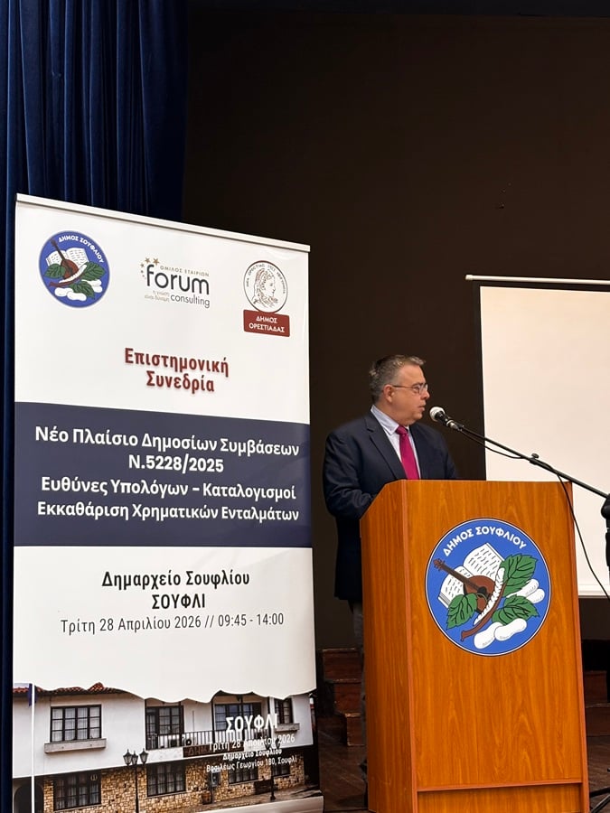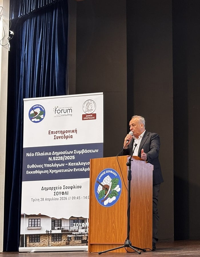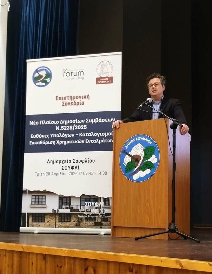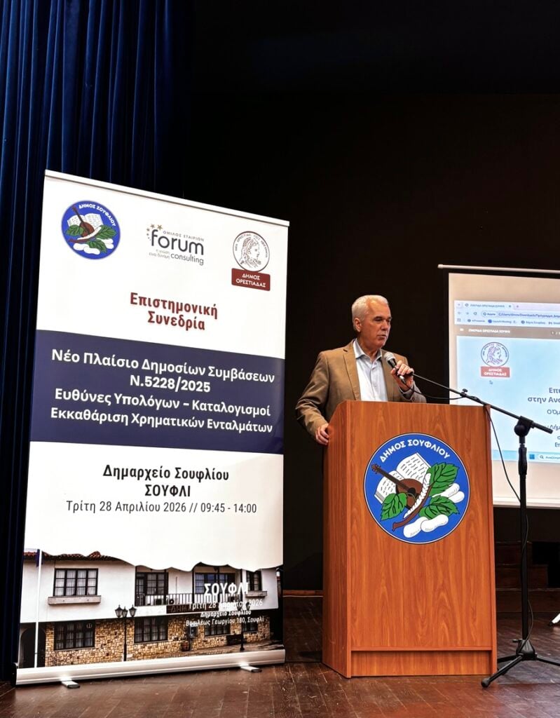 Στο Δημαρχείο Σουφλίου πραγματοποιήθηκε την Τρίτη 28 Απριλίου 2026 η δεύτερη και τελευταία ημέρα της επιστημονικής διημερίδας με θέμα «Νέο Πλαίσιο Δημοσίων Συμβάσεων Ν. 5228/2025», ολοκληρώνοντας έναν κύκλο ενημέρωσης και διαλόγου για ζητήματα που αφορούν τη λειτουργία της Τοπικής Αυτοδιοίκησης.