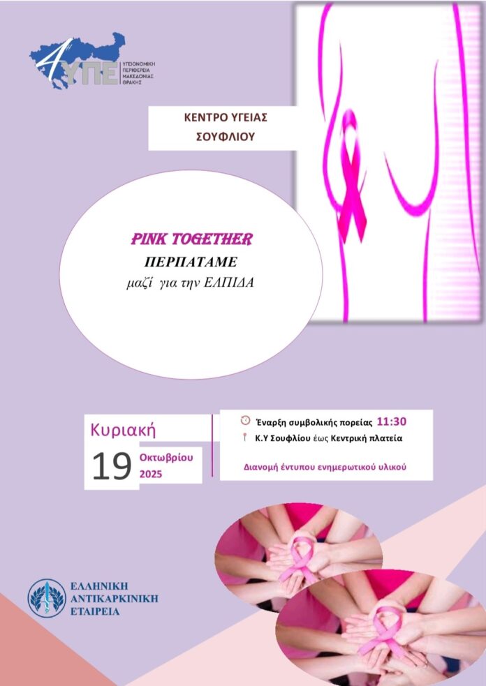 Το Κέντρο Υγείας Σουφλίου, στο πλαίσιο της ενημέρωσης και ευαισθητοποίησης του κοινού για την πρόληψη και έγκαιρη διάγνωση του καρκίνου του μαστού, διοργανώνει συμβολικό περίπατο την Κυριακή 19 Οκτωβρίου 2025 και ώρα 11:30 π.μ.