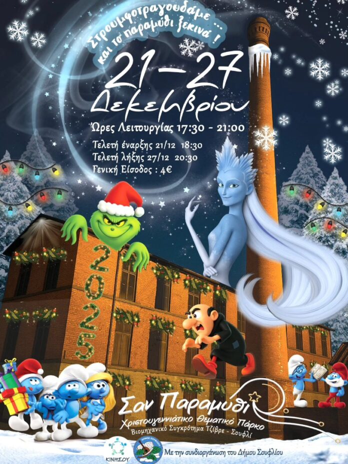 Το Σουφλί ετοιμάζεται να φορέσει… μπλε σκούφο, καθώς το αγαπημένο χριστουγεννιάτικο θεματικό πάρκο «Σαν Παραμύθι» επιστρέφει για 11η χρονιά στο βιομηχανικό συγκρότημα Τζίβρε, από τις 21 έως τις 27 Δεκεμβρίου 2025. Φέτος, τα Στρουμφάκια έχουν τον πρωταγωνιστικό ρόλο, σε μια γιορτή που υπόσχεται παιχνίδι, μαγεία και χρώμα για μικρούς και μεγάλους.