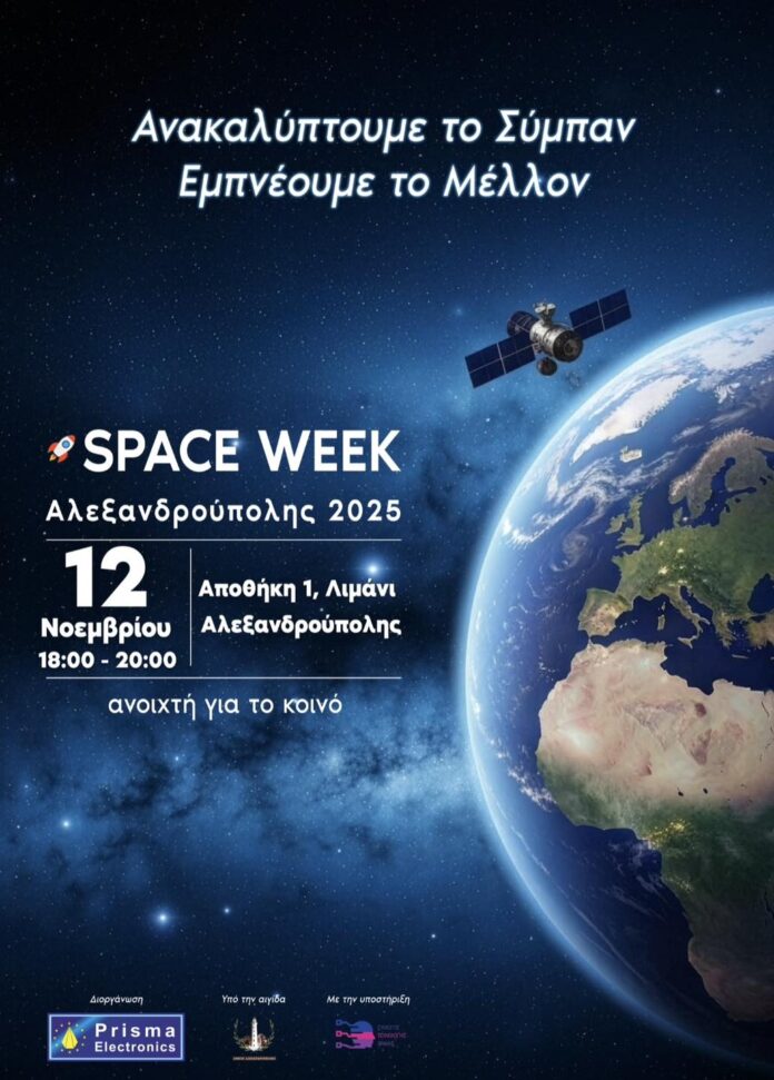 Η Prisma Electronics SA διοργανώνει την Space Week Alexandroupolis από τις 10 έως τις 14 Νοεμβρίου 2025, προσκαλώντας μαθητές και κοινό να ανακαλύψουν τον κόσμο του διαστήματος μέσα από παρουσιάσεις, διαδραστικές δράσεις και hands-on εμπειρίες.