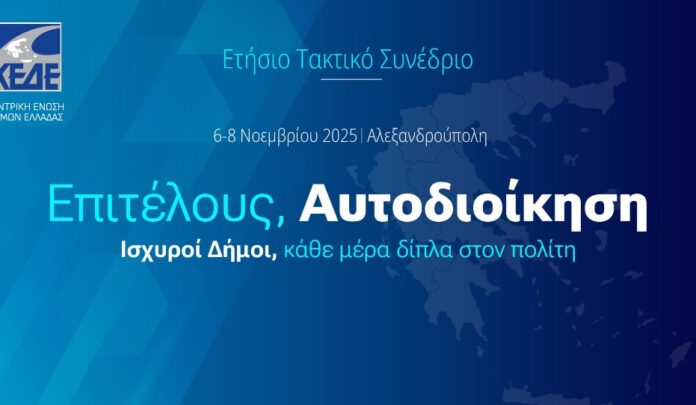 Το Διοικητικό Συμβούλιο της Κεντρικής Ένωσης Δήμων Ελλάδας, σας προσκαλεί στο Ετήσιο Τακτικό Συνέδριο, που θα πραγματοποιηθεί στην Αλεξανδρούπολη από 6 έως 8 Νοεμβρίου 2025 στο ξενοδοχείο Ramada Plaza by Wyndham Thraki.