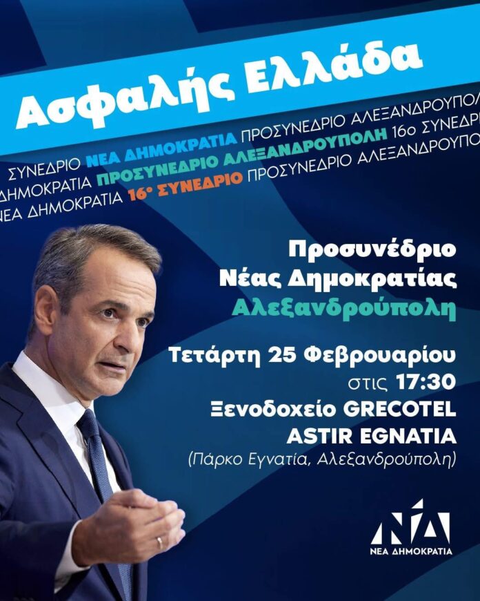 Την Τετάρτη 25 Φεβρουαρίου, στην Αλεξανδρούπολη θα πραγματοποιηθεί το προσυνέδριο της Νέας Δημοκρατίας, με την παρουσία του Πρωθυπουργού Κυριάκου Μητσοτάκη. Η εκδήλωση θα ξεκινήσει στις 17:30 στο ξενοδοχείο Grecotel Astir Egnatia.