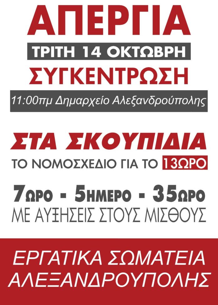 Καλούμε όλους τους εργαζόμενους, τους νέους, τους συνταξιούχους ,τους αυτοαπασχολουμένους σε συναγερμό και κοινό αγώνα. Να μην επιτρέψουμε να μας γυρίσουν έναν αιώνα πίσω, να δουλεύουμε ήλιο με ήλιο, χωρίς δικαιώματα, χωρίς ζωή!