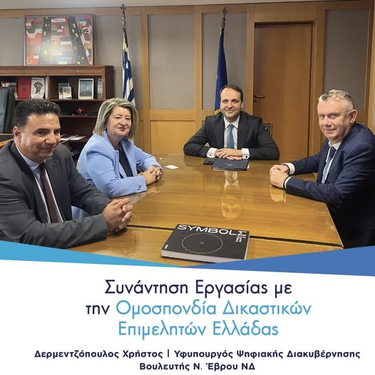 Στο Υπουργείο Ψηφιακής Διακυβέρνησης, ο Υφυπουργός Χρήστος Δερμεντζόπουλος υποδέχθηκε τη διοίκηση της Ομοσπονδίας Δικαστικών Επιμελητών Ελλάδας, με αντικείμενο ζητήματα που αφορούν το Ελληνικό Κτηματολόγιο και τη συνεργασία για την αποτελεσματική λειτουργία της Δικαιοσύνης και της διαχείρισης της ιδιοκτησίας.