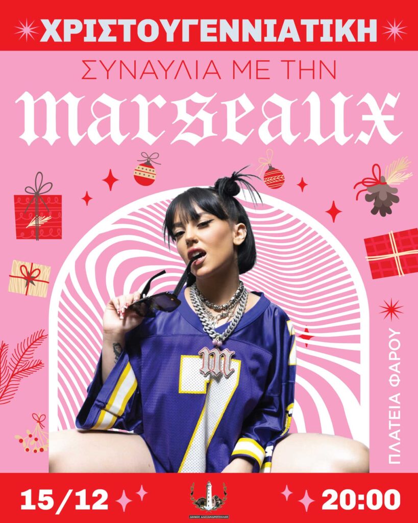 Τη Δευτέρα 15 Δεκεμβρίου, η γιορτινή διάθεση συνεχίζεται με μια μοναδική συναυλία της ιδιαίτερα αγαπητής στη νεολαία Marseaux, που υπόσχεται μια αξέχαστη μουσική εμπειρία γεμάτη ενέργεια και χριστουγεννιάτικη μαγεία.