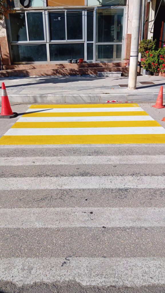 Το βάψιμο των διαβάσεων έγινε με ειδικό χρώμα διαγράμμισης λευκό-κίτρινο και συνοδεύτηκε από ρίψη υαλοσφαιριδίων αντανάκλασης, εξασφαλίζοντας καλύτερη ορατότητα κατά τις νυχτερινές ώρες.