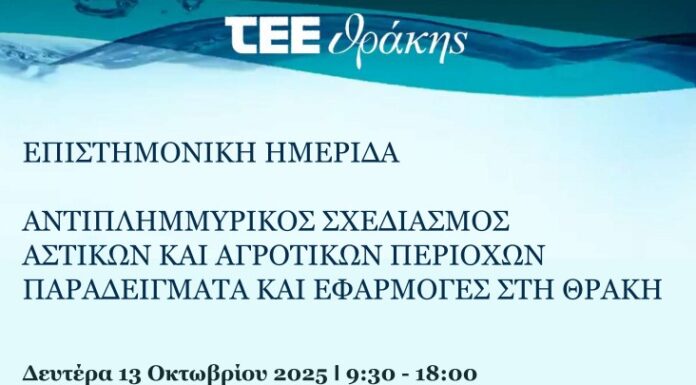 ΤEE Θράκης: Επιστημονική ημερίδα με θέμα: «Αντιπλημμυρικός Σχεδιασμός Αστικών και Αγροτικών Περιοχών – Παραδείγματα και Εφαρμογές στη Θράκη»