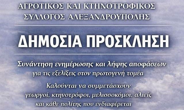 Αγροτικός Σύλλογος Αλεξανδρούπολης: Συνάντηση στις Φέρες για κρίσιμες αποφάσεις του πρωτογενούς τομέα