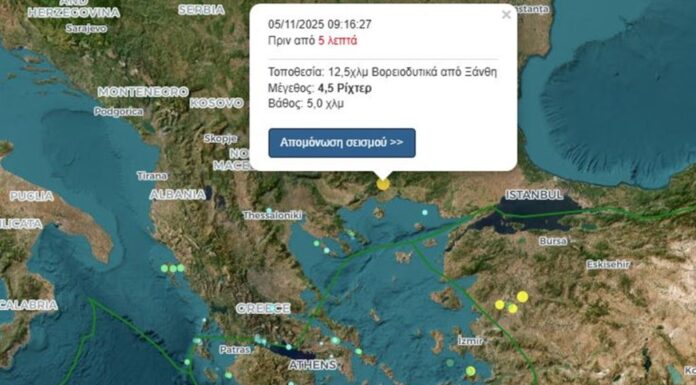 Σεισμός 4,5 Ρίχτερ βορειοδυτικά της Ξάνθης