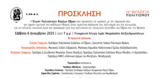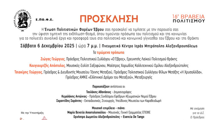 Αλεξανδρούπολη: Τα «16α Βραβεία Πολιτισμού» της Ε.ΠΟ.Φ.Ε. το Σάββατο 6 Δεκεμβρίου