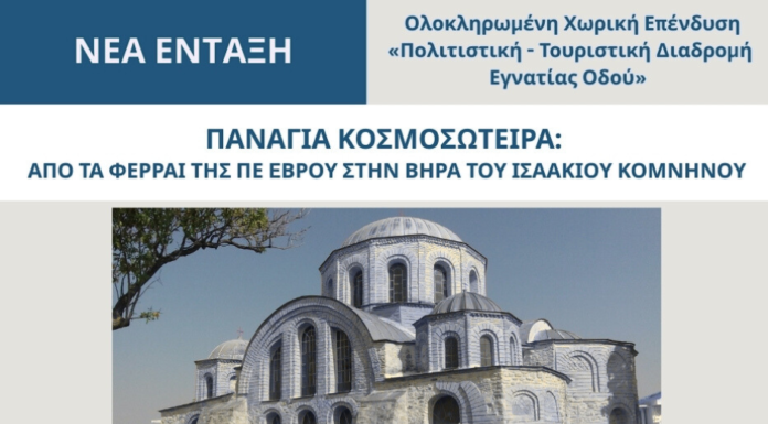 Στην ΟΧΕ «Πολιτιστική-Τουριστική Διαδρομή Εγνατίας Οδού» η Παναγία Κοσμοσώτειρα – 700.000 ευρώ για προστασία και ανάδειξη στην Π.Ε. Έβρου