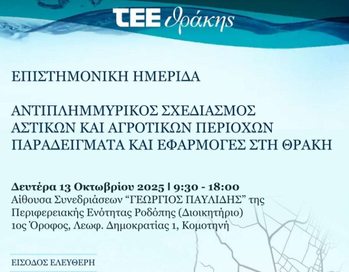 Το Περιφερειακό Τμήμα Θράκης του Τεχνικού Επιμελητηρίου Ελλάδας διοργανώνει επιστημονική ημερίδα με θέμα: «Αντιπλημμυρικός Σχεδιασμός Αστικών και Αγροτικών Περιοχών – Παραδείγματα και Εφαρμογές στη Θράκη», τη Δευτέρα 13 Οκτωβρίου 2025, από τις 09:30 έως τις 18:00, στην Αίθουσα Συνεδριάσεων “Γεώργιος Παυλίδης” της Περιφερειακής Ενότητας Ροδόπης, στο Διοικητήριο Κομοτηνής (Λεωφ. Δημοκρατίας 1, 1ος όροφος).