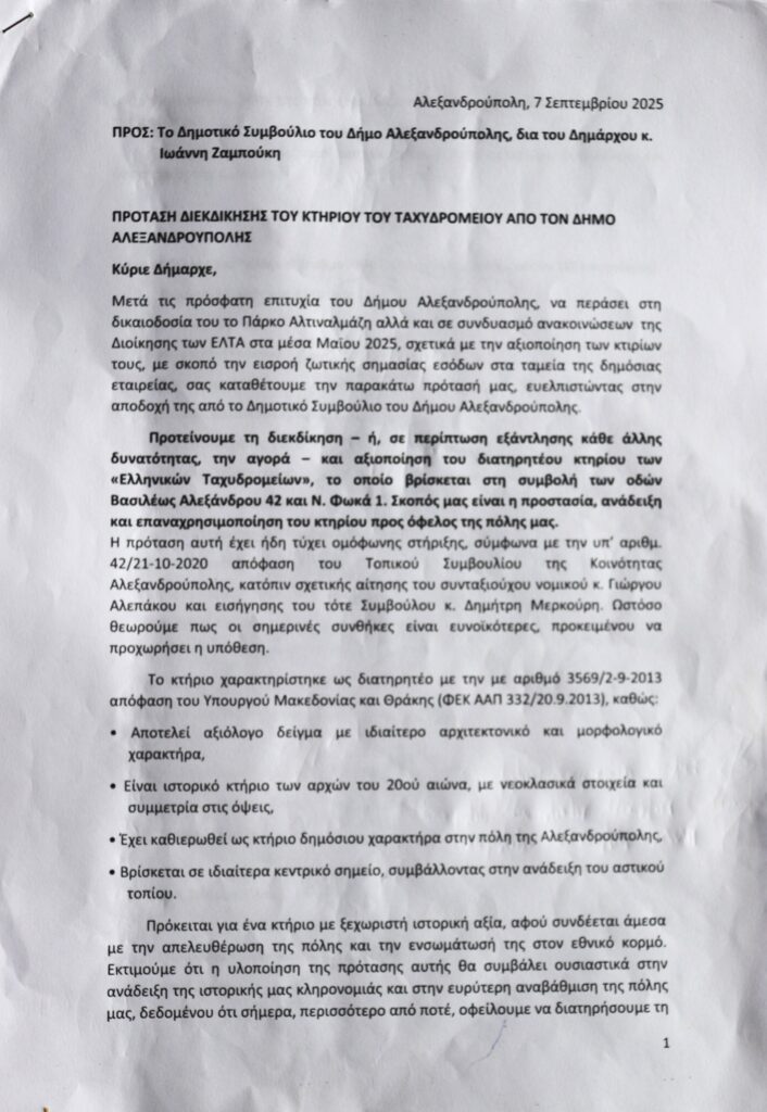 Μια σημαντική εξέλιξη σημειώθηκε στο θέμα της αξιοποίησης του ιστορικού διατηρητέου κτηρίου των ΕΛΤΑ στην Αλεξανδρούπολη. Ο Δήμος, υιοθετώντας την πρόταση των Φίλων του Γαλλικού Σταθμού Αλεξανδρούπολης και άλλων τοπικών φορέων, ενημέρωσε με την υπ’ αριθμ. πρωτ. 229/17-10-2025 επιστολή του ότι ο Δήμαρχος Ιωάννης Ζαμπούκης έχει ήδη προβεί στις απαραίτητες ενέργειες προς τη Διοίκηση των ΕΛΤΑ.